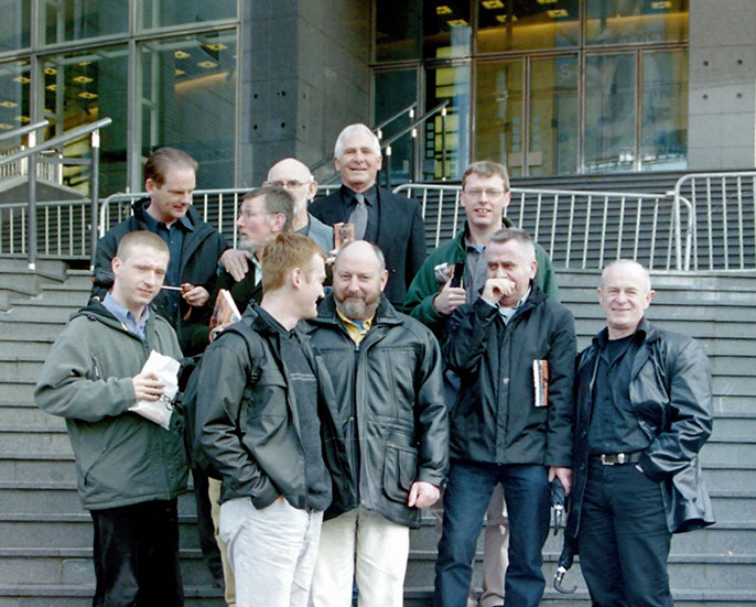 Tom, Jim and Ron with their backs to Maria's apartment